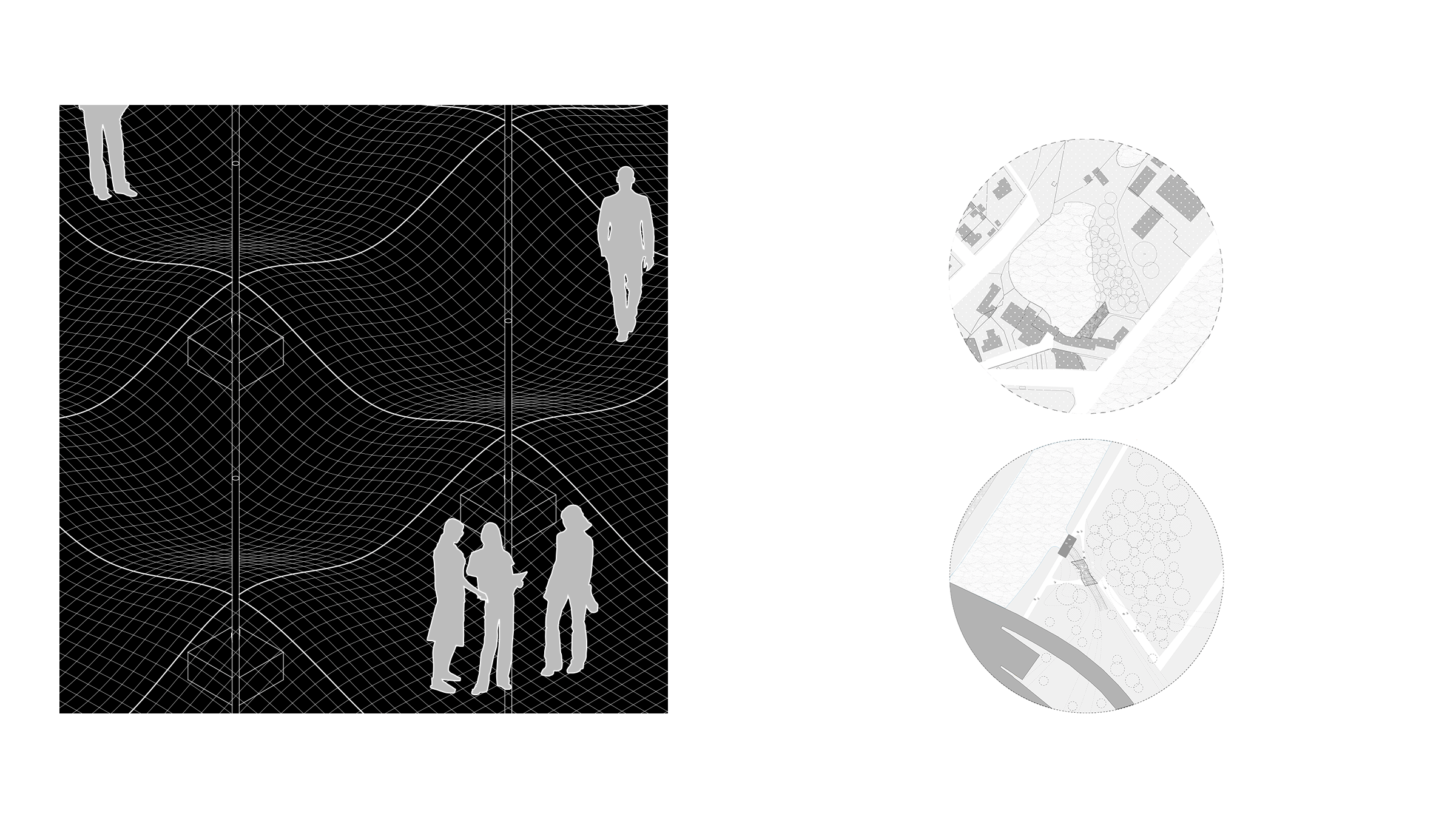 Conceived as a spatial language for inhabiting the typically uninhabitable, Liminal Dialogue unfolds across the waterscapes of South-West Flanders. The interventions may appear as singular moments or as a network of sites connecting the River Lys to surrounding ecological and urban systems. Using traditional construction safety netting as a primary material, surfaces of inhabitation are stretched, draped, pinned, stilted, and shaped over and across bodies of water.