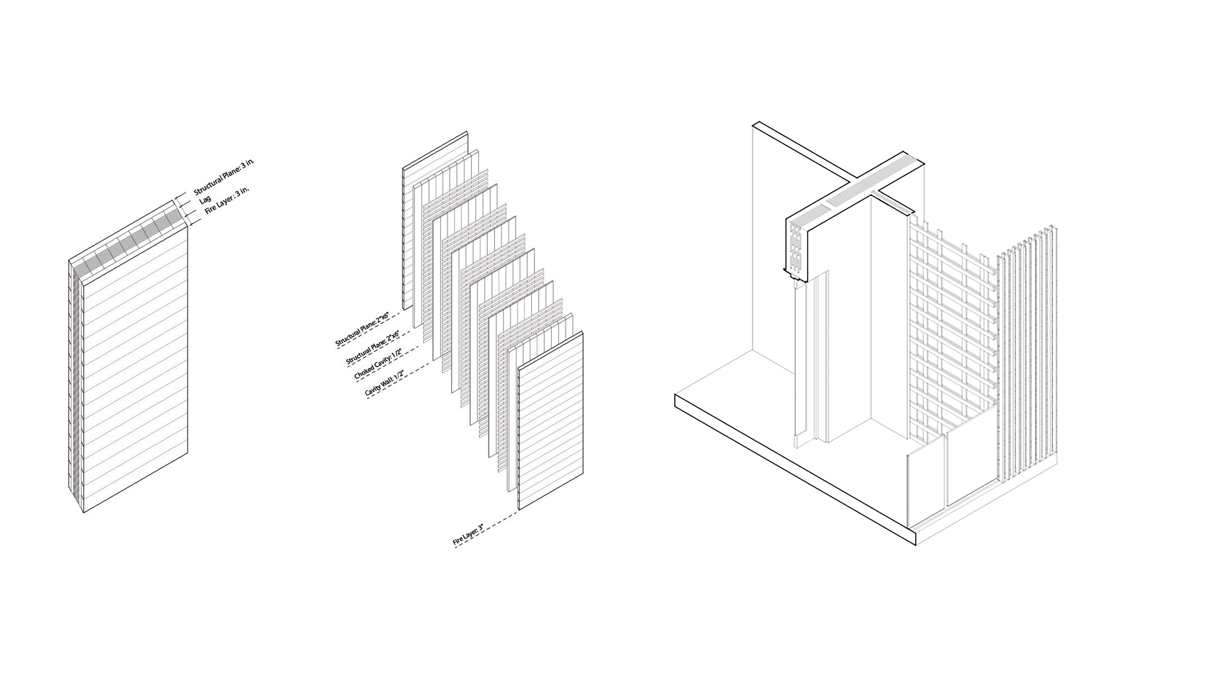 At the scale of assembly, conventional Cross-Laminated Timber systems are reconfigured into a hybrid assembly with internal “choked convection” cavities. This increases thermal performance while reducing total wood volume, enabling smaller member sizes, higher yield per log, and reduced reliance on large-diameter trees.